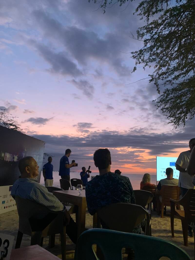 Dann schließlich kam der Aufruf, dass wir uns setzen sollten; der Film über Thomas Höpker, ein deutscher Fotograf, begann. Während den ersten Minuten wurden uns dann riesige Teller gebracht, auf denen genau das zu finden war, was ein deutsches Herz im Ausland höher schlagen lässt; Kartoffelsalat - leider nicht so gut wie der meiner Oma, Wiener Würstchen, Brezeln, Senf und vor allem Leberkäs. Maria und ich konnten unser Glück kaum fassen und haben über diese Glücksmomente des Essen den Film nicht ganz aufmerksam verfolgt. Aber vor einer Stunde hätten wir uns im Leben nicht vorstellen können, dass wir gleich am Strand sitzen, bei Sonnenuntergang einen Film auf deutsch sehen und dabei Brezeln und Kartoffelsalat essen können. Der krönende Abschluss kam dann, als uns warmer Apfelstrudel mit Vanillesoße gebracht wurde. Bis jetzt weiß ich nicht, ob das wirklich passiert ist oder nur ein wirklich viel zu schöner Traum war - die Bilder (unten) erzählen aber eine eindeutige Geschichte.